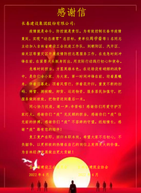 “危难时刻担当,方显英雄本色。在这场没有硝烟的战争中,你们舍小家、为大家,第一时间冲锋在前,迎着晨曦来,伴着日暮走;顶着风雪行,伴着花开归......”日前,吉林省建设工会、吉林省建筑业协会给建设集团发来感谢信,向建设集团下沉志愿者的勇敢担当、辛勤付出致以崇高敬意和诚挚感谢。